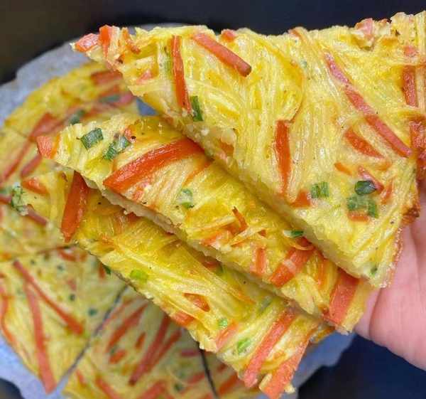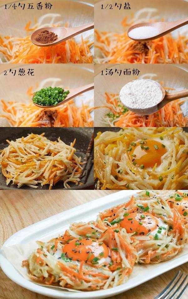 (2)平底鍋刷油,將土豆胡蘿卜絲放入鍋內,用筷子在中間撥出個洞,形成鳥巢形狀。
