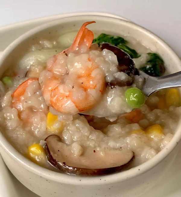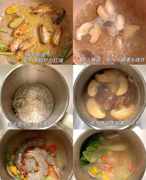 (2)洗凈大米倒入迷你養生壺中,再倒入香菇水。煮至濃稠後加入蝦仁、時蔬、青菜,加入1勺白胡椒粉 、1勺鹽調味,燜煮5分鐘即可。