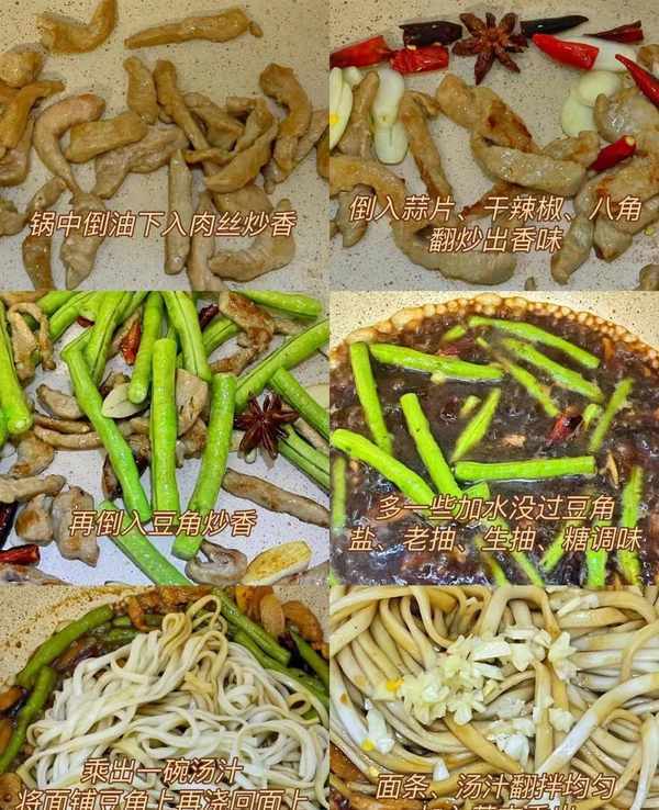 (3)鍋中倒油,下入肉絲炒香,加入蒜片、幹辣椒、八角炒出香味,再加入豆角繼續翻炒