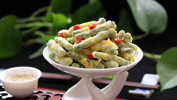 準備材料:豆角、雞蛋、玉米粉和面粉、大蒜、白芝麻。調味料有:生抽、醋、香油和鹽。