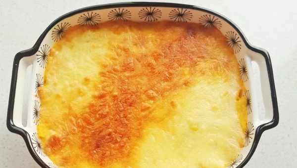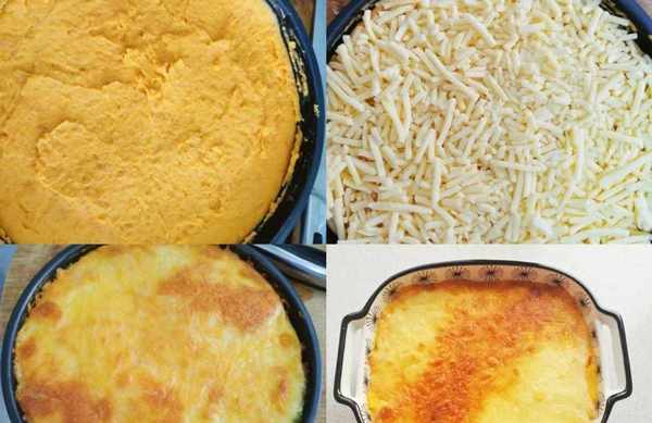 3.攪拌均勻之後把紅薯泥鋪平,蓋上一層芝士。