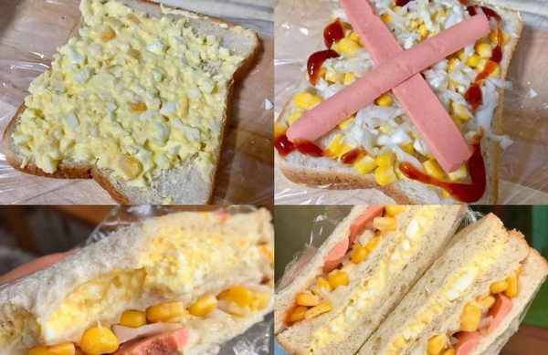 3.玉米粒和沙拉醬混合鋪上去,再將火腿腸切開擺好。