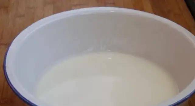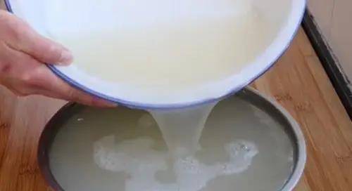 11、面水靜置一個晚上之後,淀粉都沉淀到盆底瞭,這個時候我們把上面的清水倒掉。(註意:清水不要完全倒掉,要留出2厘米高度的清水)