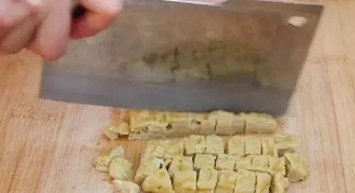10、面筋蒸熟之後取出鍋晾涼,放涼後再用刀切成小塊兒,這樣我們的面筋就制作完成瞭。