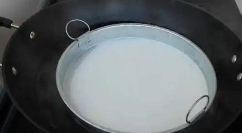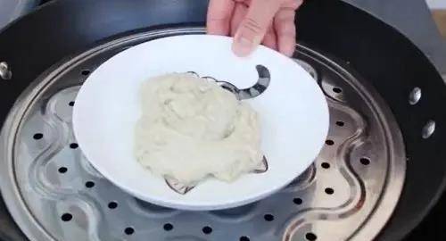 13、準備一個盤子,在盤子上面刷一層薄薄的食用油防粘,然後舀一勺面糊水倒入盤中輕輕晃動攤勻,再把盤子放入開水鍋中,蓋上蓋子大火蒸2~3分鐘,看著涼皮慢慢的變成時尚色,鼓起泡泡就蒸好瞭。
