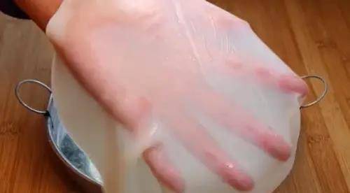 14、涼皮蒸好之後取出放入涼水盤中,冷涼後在涼皮表面刷上一層薄油,這樣很輕松就能把涼皮揭下來瞭。500克的面粉我做瞭20多張涼皮,一張都沒有斷裂破皮,而且韌性特別好 。