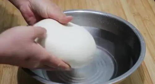 4、開始洗面,先在盆裡多倒入一些清水,再放入之前揉好的面團,然後像洗衣服一樣用手反復搓抓揉,讓淀粉和面筋分離,多搓揉幾次後慢慢的淀粉就會沉淀到水裡,剩下的就是面筋瞭。