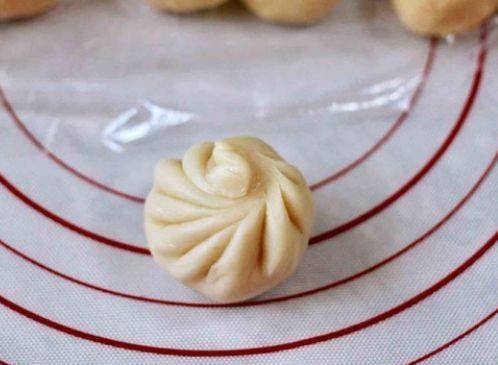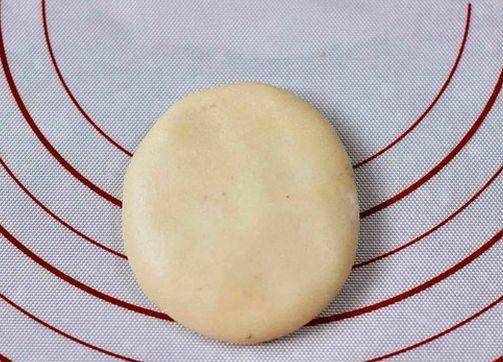 第十步,然後用搟面杖搟成圓形,包上紫薯餡,收口包好朝下放置,摁扁,依次做好所有的