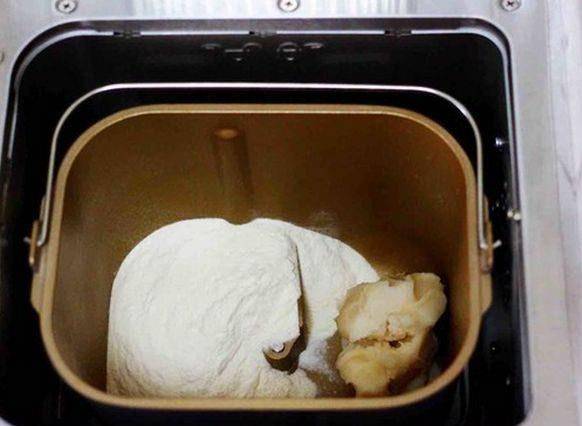 制作步驟:第一步,首先把所有的食材需要的重量稱好,將面包機裡面擦洗幹凈,倒上清水和豬油,再倒入中筋面粉,最後倒上白砂糖