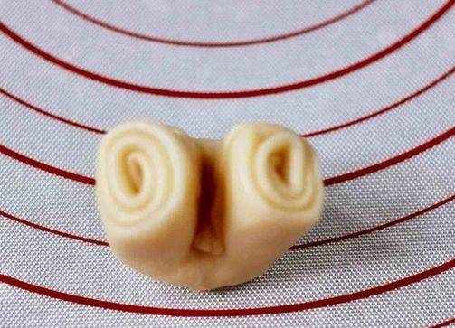 第九步,松弛好的面卷,從中間對折一下,用手捏緊之後摁扁