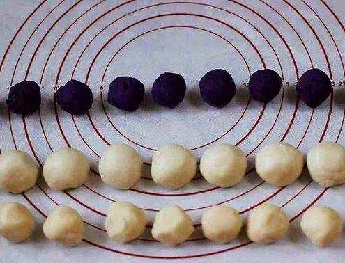 第五步,把和好的紫薯餡,分成9個相等的圓球,每個紫薯餡的大約在24克左右,水油皮和油酥分別均分為9等份,水油皮一個約22克,油酥一個約14克左右