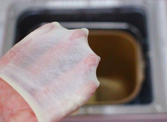 第二步,啟動面包機的和面程序,直到面團可以拉出薄膜的時候,就可以瞭