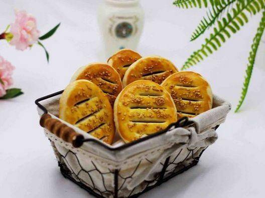 第十一步,拿刀在餅胚上劃上3刀,註意不要劃的太深瞭,放置爆口,然後在上面撒上白芝麻