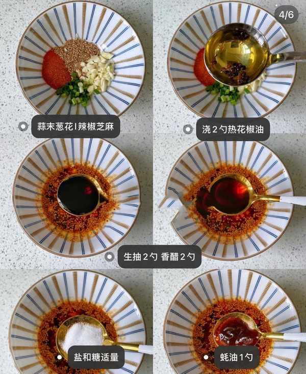 澆兩勺熱花椒油,2勺生抽,2勺香醋,少許鹽和白糖,1勺蠔油攪拌均勻