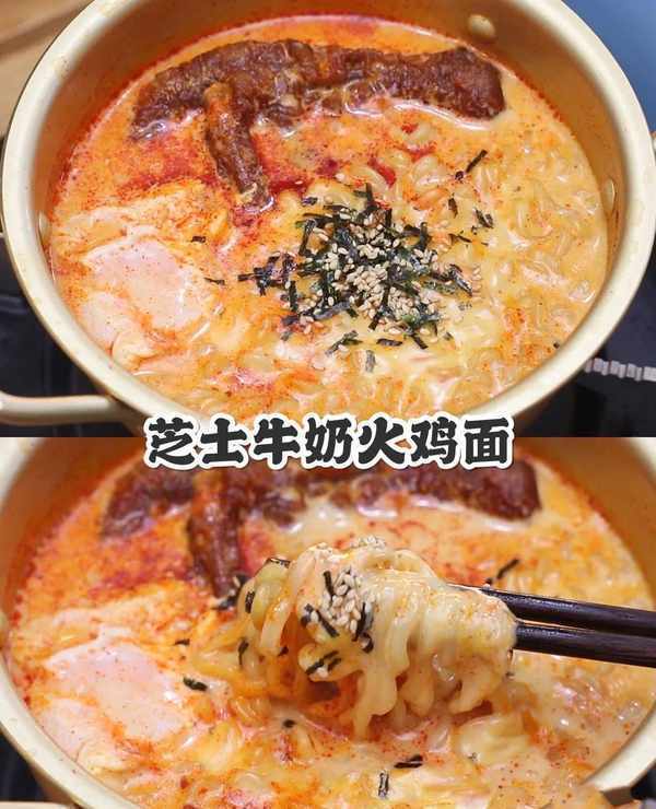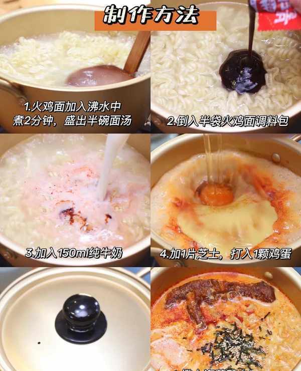2.倒入半袋火雞面調料包,加150ml純牛奶