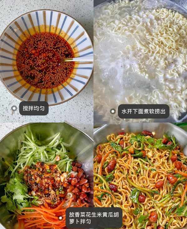 方便面、蒜末、蔥花、辣椒粉、熟芝麻、花椒油、生抽、香醋、鹽、白糖、蠔油,黃瓜、胡蘿卜、香菜、熟花生米