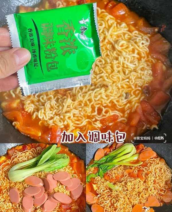 2.鍋中少許油放入番茄炒出湯汁,倒入肉醬包,加入一碗水煮開,放入方便面煮軟