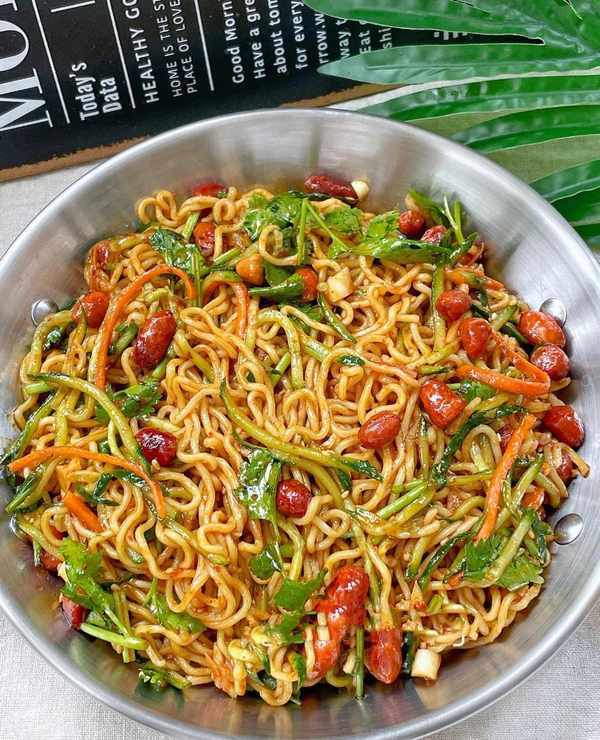 2.泡面放入沸水中煮3分鐘,撈起過涼水,放上胡蘿卜絲和黃瓜絲,淋上醬汁拌勻即可。