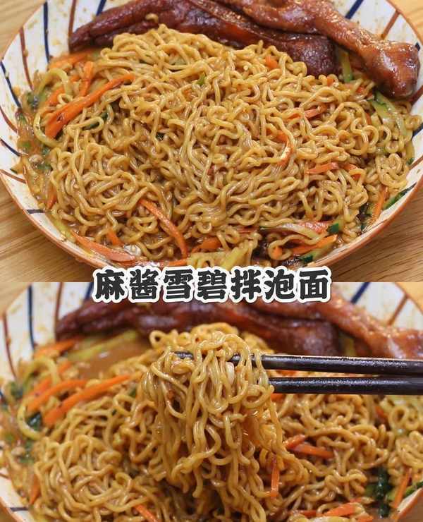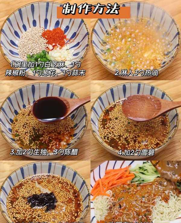 方便面、白芝麻、辣椒粉、蔥、蒜、油、生抽、陳醋、雪碧、芝麻醬、老幹媽,黃瓜,胡蘿卜