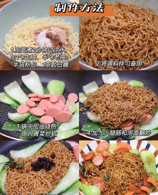 3.鍋中加油燒熱,倒入青菜炒軟,加入火腿腸和泡面翻炒