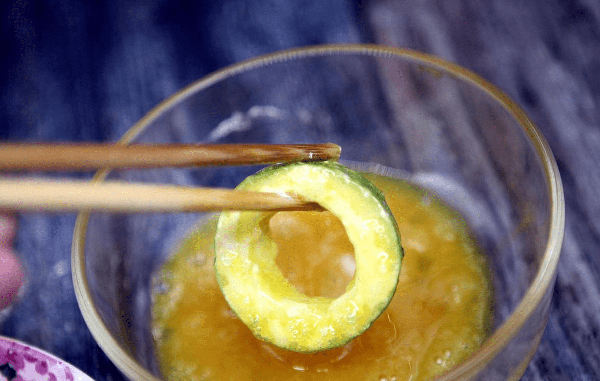 3.把一個雞蛋在碗中打散,放入少許料酒、食鹽,料酒可以去除蛋腥味並且增香,加入食鹽有底味,煎制的時候就不要加鹽瞭。把拍上面粉的西葫蘆圈挨個拖上雞蛋液。