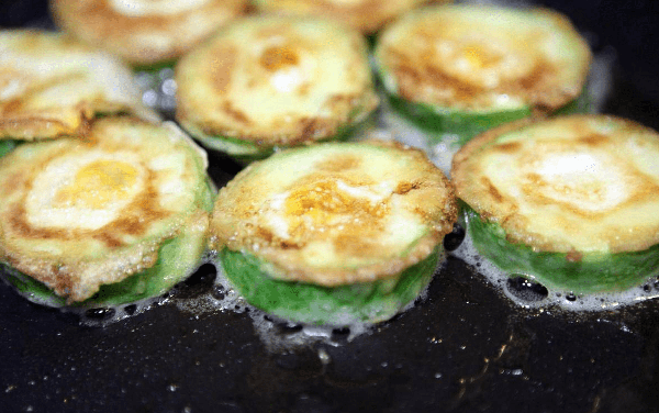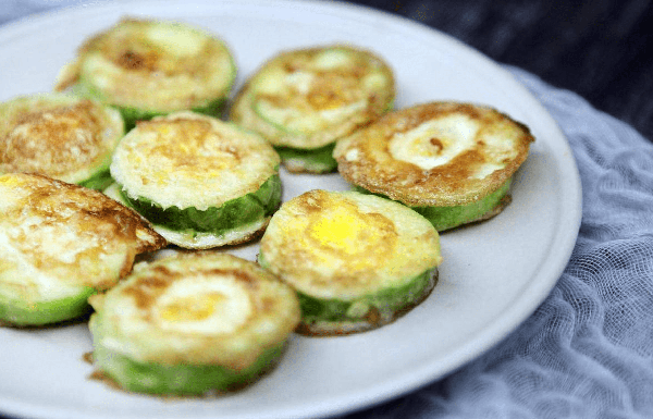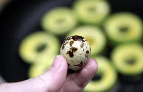 4.煎鍋加入適量的食用油燒熱,把西葫蘆圈放入煎制。鵪鶉蛋提前清洗幹凈外殼,挨個打入西葫蘆圈裡。