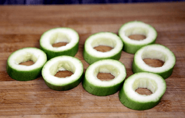 1.選一個外形比較正的西葫蘆,清洗幹凈,切成厚片,厚度大約1厘米左右。然後用小刀挖出西葫蘆瓤,做成西葫蘆圈放一邊備用。