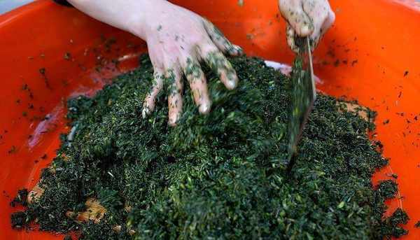 4、擠幹水分,去除大部分墨綠色的汁葉,做出來蒿子粑粑不會太黑。