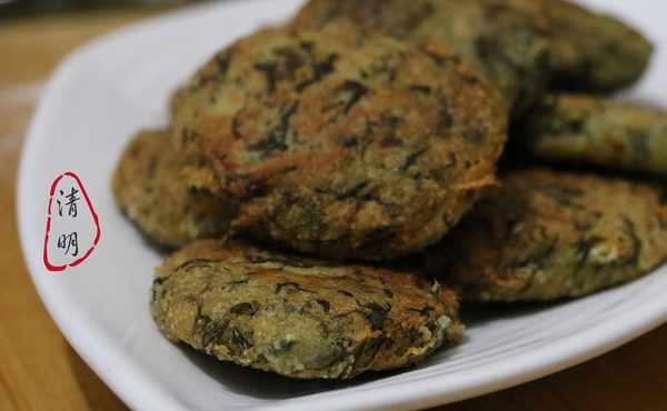 而江北地區多用米面(非糯米粉)和白蒿(婁蒿)為主材料,選用鮮美的蒿葉尖,洗凈、焯水、擰幹,去除大多數的墨綠色汁水,然後將蒿葉切碎,與臘肉丁混合,放入適量米面,以鹽調味、溫水調和,合成團,分成劑子,壓成餅狀,吃法可蒸可煎,好吃不沾牙。