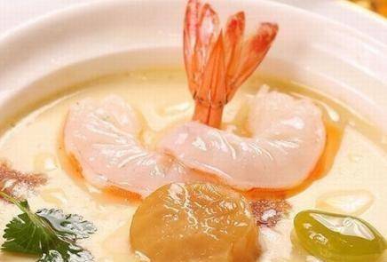 5、再次取出蒸蛋,把鮮蝦、瑤柱、香菜葉都放在蛋面上,入蒸櫃蒸4——5分鐘即可取出上菜。
