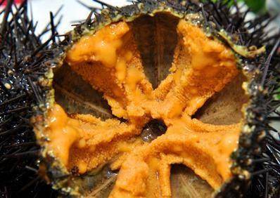 1,海膽打開的方法,找到海膽的口器(海膽體面上有一個手指頂大小的小圓圈,那就是它的口器)可以用剪子在口器處逐漸剝開,並把口器除掉就可以瞭。