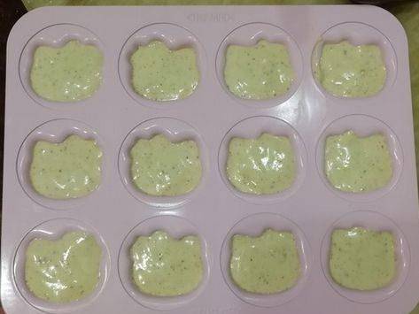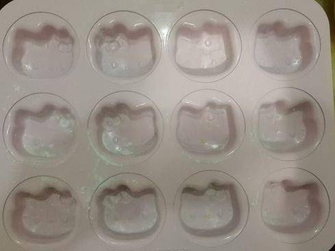 第八步,然後翻拌均勻,這個過程速度要快,將和好的沒監護倒在Kitty連模中,九分滿即可