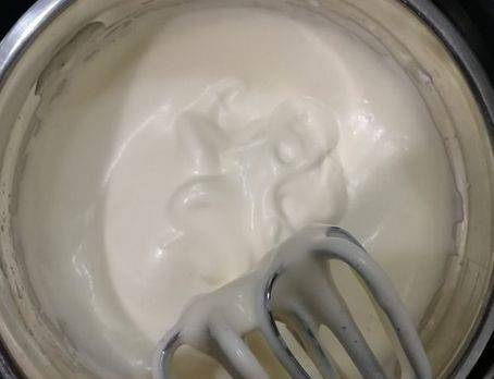 第五步,倒上砂糖和蜂蜜,用電動打蛋器進行打發,打至蛋糊變白,體積膨脹的時候,提起打蛋器的頭,滴落的蛋糊能夠劃八字,並且不會很快消失的時候,轉低俗沿著盆打一圈出大氣泡