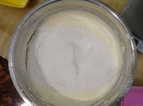 第六步,篩入低筋面粉,用翻拌的手法進行混合,從中心點入底部從盆邊翻起來,攪拌均勻,預熱烤箱,上下180度