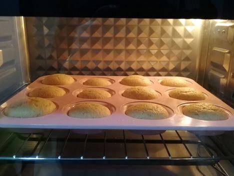 第九步,提起模具輕震一下烤盤,震出氣泡,放入預熱好的烤箱中,調上下160度,烤15分鐘,待表面上色,微微回落的時候,即可出爐
