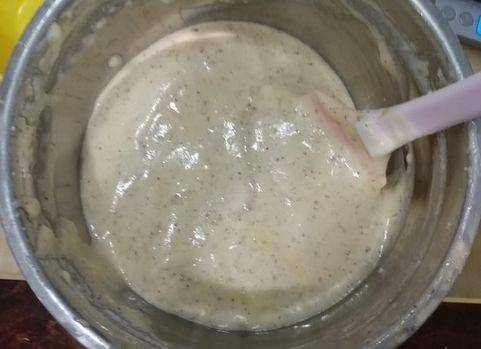 第七步,倒入棗泥,繼續用翻拌的手法攪拌均勻,將玉米油倒在刮刀上面,讓玉米油沿著刮刀流入盆中