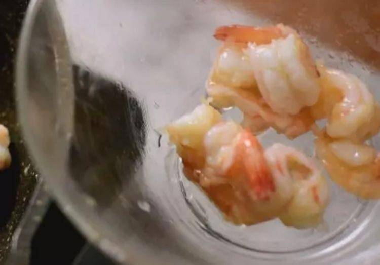 第四步,鍋裡添上油,放入醃制好的蝦仁,快速翻炒至變色,成蝦球的狀態時撈出來