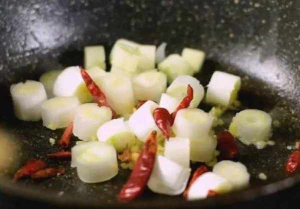第五步,鍋中留下底油,下入切好的薑末、蔥圈、幹辣椒,爆炒