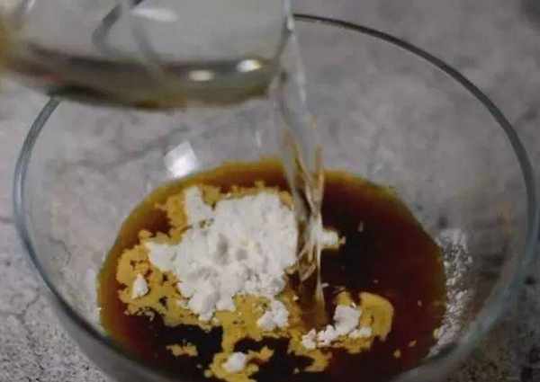 第三步,取出一個幹凈的小碗,加上糖、生抽、醋、淀粉,以及清水,攪拌均勻