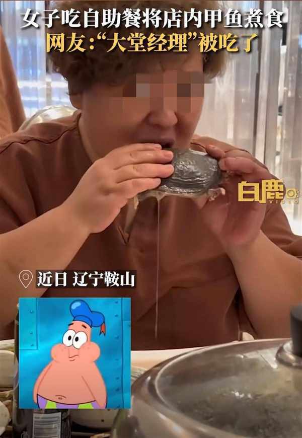 近日,遼寧鞍山的趙女士和傢人一起吃自助餐時,發現姑姑煮熟並吃掉瞭店內的甲魚,引起廣泛關註。(據3月27日陜西網白鹿視頻)