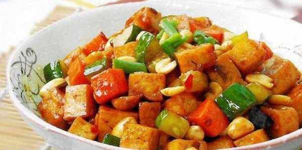 1.花生米用油炸熟備用;豆腐汆燙後切小丁炒鍋註油燒熱,下豆腐丁炸至金黃色撈出瀝油用糖、醋、醬油、 料酒、鹽、濕淀粉、雞精加少許清水調成汁