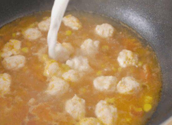 第七步,倒上適量的清水,放入玉米粒煮開,用勺子舀上一勺的蝦滑,輕輕的放入鍋中,做好你想要吃的量
