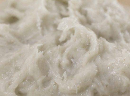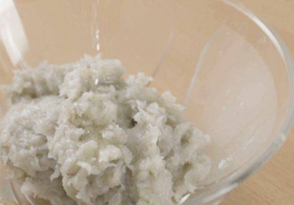 第三步,打好的蝦糜放在容器中,磕上一個雞蛋清,調上1勺鹽、料酒,用手抓拌均勻,順著一個方向攪拌,使得蝦糜能夠更加的勁道