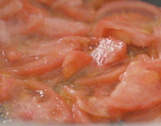 第六步,去掉蒂,切成小番茄塊,在鍋中倒上適量的食用油,燒至7成熱的時候,放入番茄塊煸炒出汁