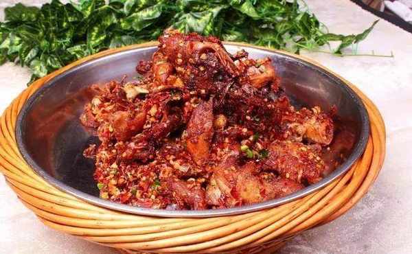 3、鍋入色拉油75克燒至四成熱,下幹辣椒碎、蒜蓉各30克煸香,下入鴨肉,調入生抽7克、蠔油5克、味精、雞精各3克、鹽2克略炒,沿鍋邊淋入5克花椒油,撒白芝麻、香蔥碎翻勻出鍋即成。