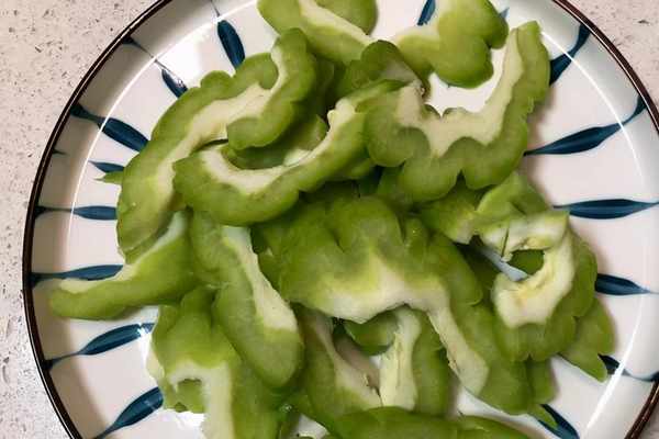 【苦瓜炒雞蛋】所需要的食材:苦瓜一根,雞蛋兩個,花生油適量,鹽適量,生抽適量,蠔油一勺,蒜蓉一小碟。做法步驟:第一步:準備所有的食材,苦瓜用刀子切開兩半後去籽再沖洗幹凈後,用刀子切成大小均勻的薄片放進盤中備用。