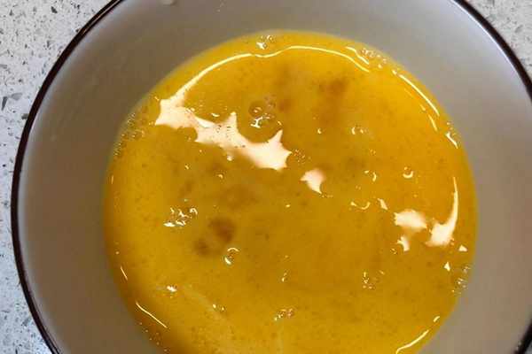 第二步:冰箱取出兩個雞蛋打碎後,倒入碗中加入適量的鹽,適量的花生油,適量的生抽和少許清水用筷子快速攪拌均勻備用。