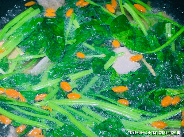 2、菠菜摘洗幹凈,切掉根部,枸杞用水泡10分鐘後洗幹凈。薑切絲。燒一鍋開水,放入適量食鹽、食用油,倒入菠菜煮1分鐘,撈出瀝幹水分。
