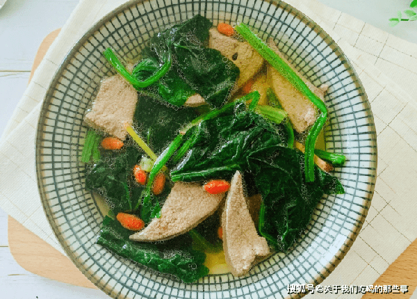 3、起鍋燒油,放入薑絲煸炒出香味,倒入適量開水煮開,放入豬肝片,大火煮1分鐘,加入菠菜和枸杞,煮約1分鐘,加適量食鹽、雞精調味,即可出鍋。