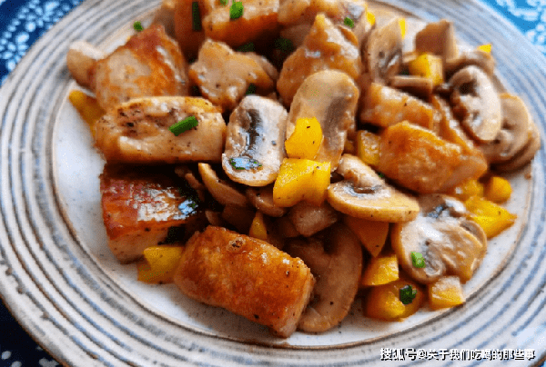 1、雞胸肉洗幹凈,切成小塊。口蘑洗幹凈切片,彩椒切丁。平底鍋放入適量植物油,燒熱後放入雞胸肉、口蘑,小火煎一會兒,煎至雞肉顏色金黃,口蘑變軟即可。